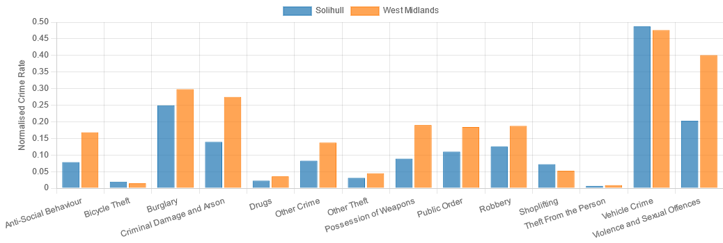 In 2020, the overall crime rate was 61 crimes per 1000 people, 49% lower than the West Midlands’ average of 91.
