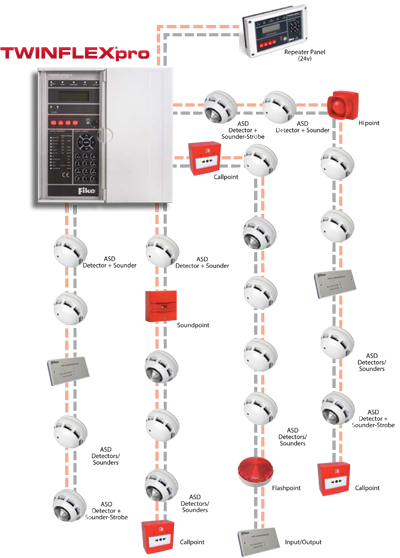 Twinflex Pro two wire fire alarm system incorporating the Multipoint ASD combined smoke and heat detector with optional built-in sounder and strobe, allows the whole system to be easily installed using only one pair of wires per zone.